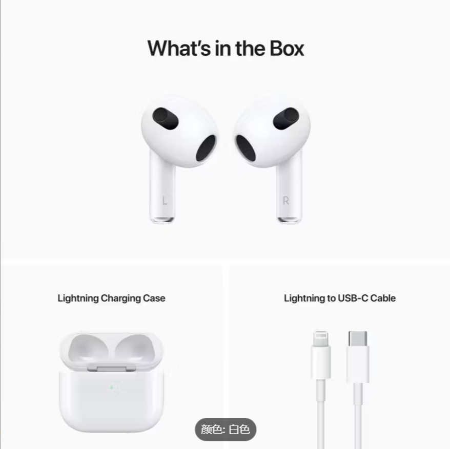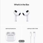 Description: Experience the next-generation wireless audio with Apple AirPods (3rd generation), designed for immersive sound, effortless connectivity, and all-day comfort. Featuring spatial audio with dynamic head tracking, adaptive EQ, and a custom acoustic design, these AirPods deliver rich and detailed sound at every moment. The included Lightning charging case provides up to 30 hours of total listening time, and the IPX4 sweat- and water-resistant design ensures durability during workouts and everyday use. Simply bring the case close to your iPhone to use instantly. Key Features: Personalized Spatial Audio with dynamic head tracking, Adaptive EQ that adjusts sound in real-time, Up to 6 hours of listening on a single charge (30 hours with the case), Includes Lightning charging case, Sweat- and water-resistant (IPX4), Quick pairing with Apple devices via H1 chip, Control music and calls using the force sensor.